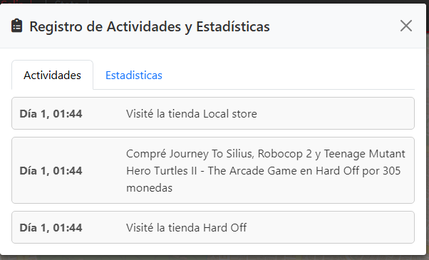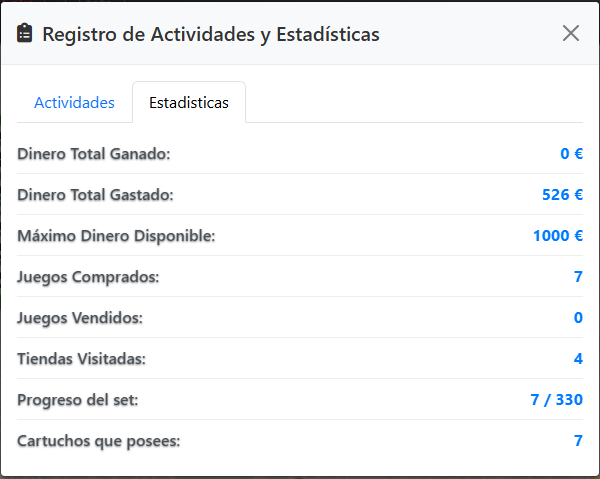 He creado una pantalla donde poder ver las estadísticas. Y ha sido más largo de lo que esperaba. Por un lado quería registrar las actividades del jugador (ha ido a una tienda, ha comprado N juegos…) y por otro las estadísticas de la partida (dinero que se ha gastado, dinero que ha ganado, juegos que tiene, juegos que le faltan…) . La segunda parte es la más sencilla: se crea una entidad y según vaya comprando o vendiendo juegos (o en eventos) se actualiza la entidad según sea el caso, si por ejemplo el jugador compra un juego se actualiza el dinero que tiene, mientras que el número de juegos que tiene se puede obtener con una consulta. La primera tenía algo más de miga, ya que si quería registrar las visitas a una tienda tenía que crear una tabla intermedia entre el jugador y la tienda donde registrar la hora de la visita.