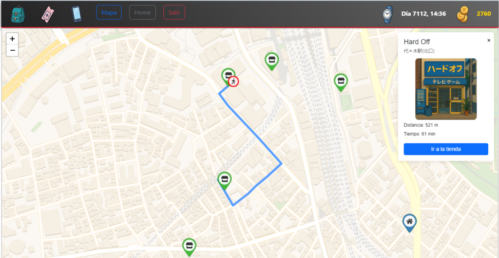 Empecé con la cabecera, donde va la fecha y las monedas además de algunos iconos que de momento no se usan pero serán útiles en el futuro. Hay tres botones sueltos que uso para hacer pruebas e ir directamente al mapa, a casa o salir de la partida, no les hagáis mucho caso. Diseño sencillo, un degradado y una línea debajo. Los iconos me los hizo ChatGPT, que me está ayudando mucho.